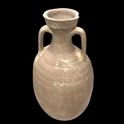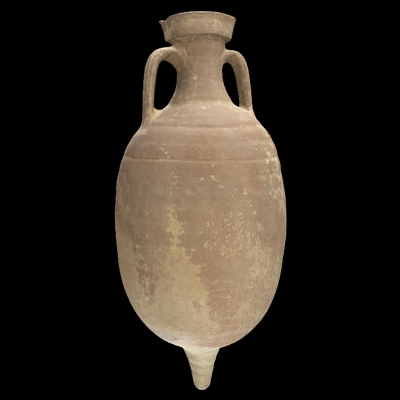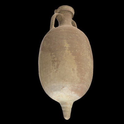 40-30 BCOvoidal amphora, called Tarraconense 1 / Laietana 1, is one of the first local productions of this type of container used to contain and transport wine. It has a marked and slightly open edge with a small outer lip, without a seal. The neck and the handles are short, the handles have a double incised line. Marked foot. It retains part of the white slip. It is one of the few whole pieces of this form found at Baetulo.