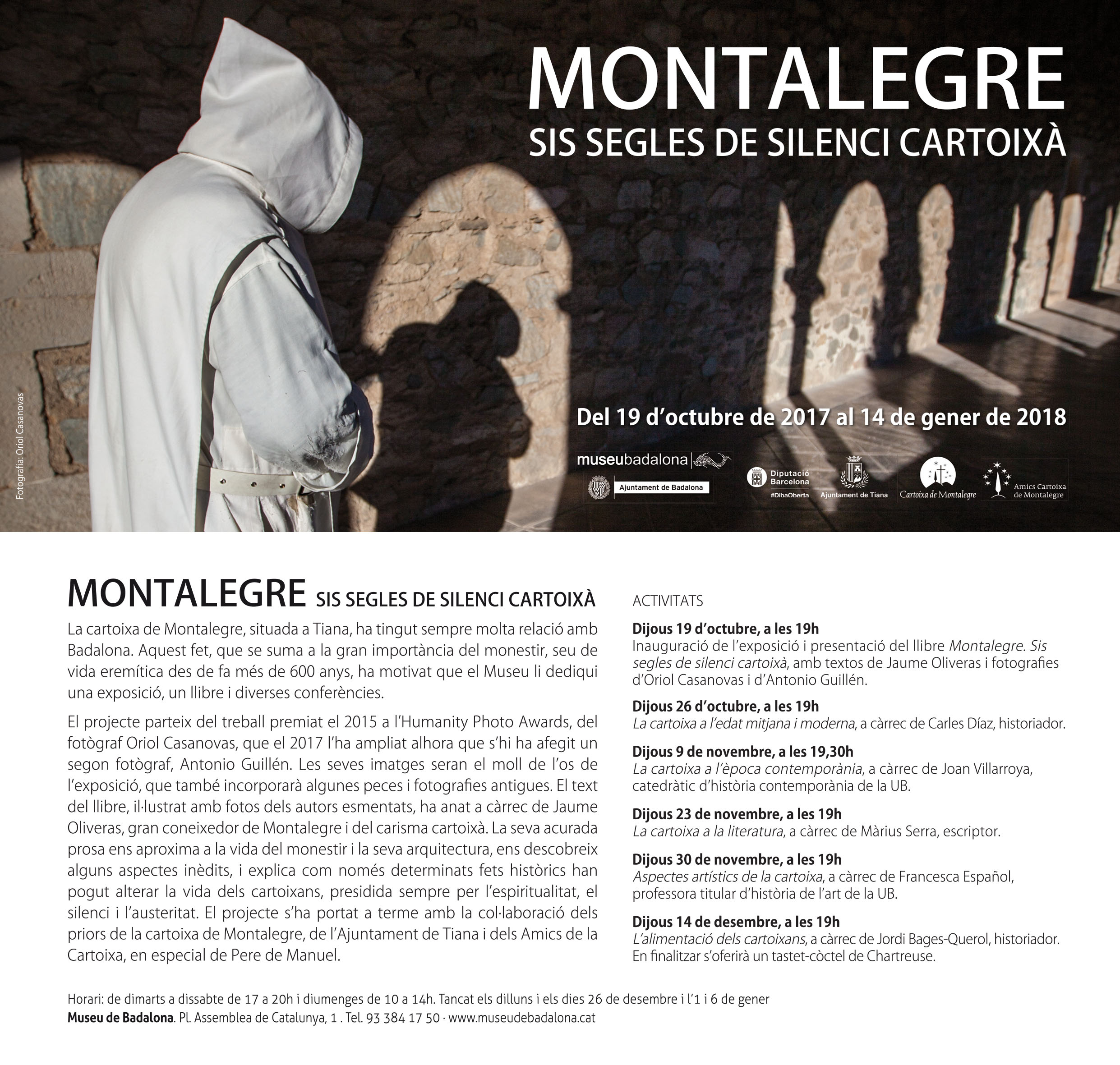 El proyecto parte del trabajo premiado en 2015 en el Humanity Photo Awards, del fotógrafo Oriol Casanovas, que en 2017 lo ha ampliado a la vez que se ha añadido un segundo fotógrafo, Antonio Guillén. Sus imágenes serán el núcleo de la exposición, que también incorporará algunas piezas y fotografías antiguas. La publicación, ilustrada con fotos de dichos autores, ha corrido a cargo de Jaume Oliveras, gran conocedor de Montalegre y del carisma cartujano. Su esmerada prosa nos aproxima a la vida del monasterio y su arquitectura, nos descubre algunos hechos inéditos, y explica cómo sólo determinados hechos históricos han podido alterar la vida de los cartujos, presidida siempre por la espiritualidad, el silencio y la austeridad .