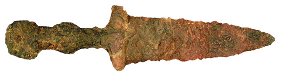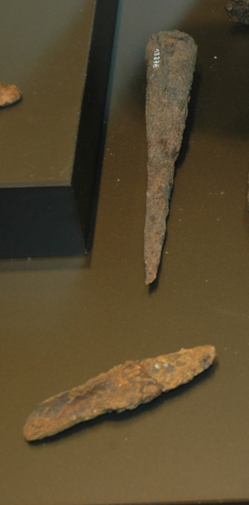 Para empezar, tenemos una espada (spatha) de hierro, en nuestro caso quizás un gladius hispaniensis, fruto de una hibridación entre la espada de La Tène celtibérica (una espada larga de entre 75 y 90 cm) y la falcata íbera (espada corta de unos 50-60 cm), que adoptan los romanos al llegar a la península Ibérica, y que es ideal para el combate cuerpo a cuerpo. En Cataluña, la espada tipo La Tène está ampliamente documentada en época ibérica (53 ejemplares por sólo 5 falcatas, mucho más presentes pasado del Ebro). Aunque no se aprecia muy bien, a la espada de Baetulo, se conservan restos de la funda, llamada vaina, que en este caso era de madera y hierro.También conservamos un puñal o daga (pugio) entero. Era un arma que tanto llevaban los soldados como los caballeros y senadores, y se asocia a asesinatos y suicidios. ¿Recuerdan el asesinato de Julio César en la entrada del senado un idus de marzo del 44 aC? Pues se hizo con varios puñales muy similares al de Badalona. Este es también de tradición celtibérica y tiene una cronología que, en nuestro caso, podría ser el siglo II-I aC. Hay otros en el Turó del Vent, en Llinars del Vallès (donde también se conserva la vaina), y en el Turó de les Maleses, en Montcada i Reixach, todos ellos de hierro.En nuestras colecciones hay, asimismo, una punta de lanza (hasta) y un Aristol de hierro, que es la parte de abajo de la lanza, también acabada en punta para clavar en el suelo o, si era necesario, para usarla pinchando el enemigo. Los romanos, además de la lanza, tenían dos tipos de armas arrojadizas más: la jabalina más pesada (pilum) y otra jabalina más ligera.