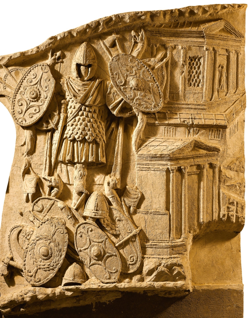 Los romanos tenían una manera clara de manifestar sus victorias. Más allá de rituales religiosos, estaba el símbolo de la victoria, un palo clavado en el suelo -a veces en forma de cruz- donde se colgaban las armas, los escudos, los cascos … de los enemigos derrotados. Representaciones similares a la de la pieza de Badalona, las encontramos en el reverso de algunas monedas, en la columna trajana o incluso en un camafeo. Con Augusto llegó la llamada pax romana, pero tristemente las guerras en el Imperio, por un motivo u otro, nunca dejaron de existir.