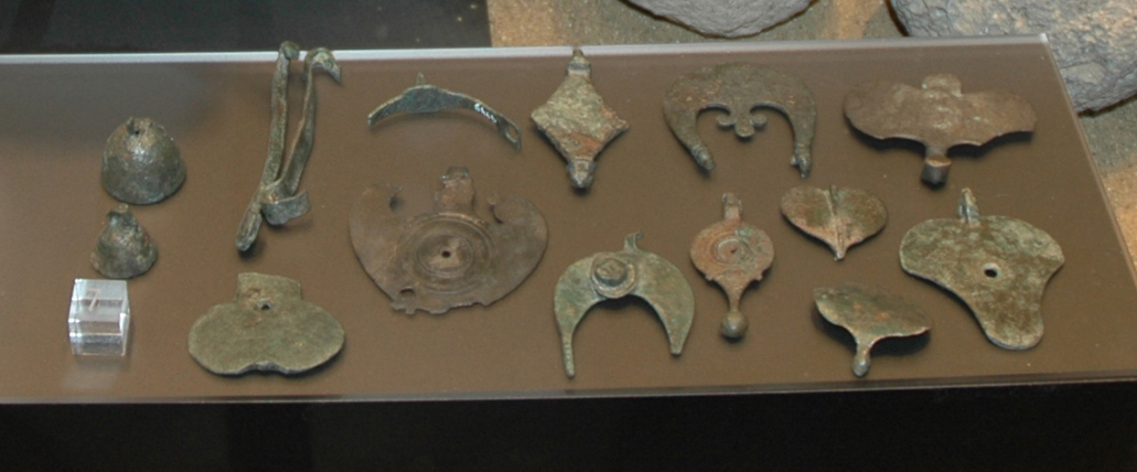 Finalmente, no queremos dejar de hablar de la caballería. Los jinetes siempre utilizaban un espada larga muy parecida a la que conservamos en el Museo, tal vez incluso más larga. De esta sección del ejército conservamos algunos elementos de la indumentaria metálica que llevaban los caballos, principalmente la parte de los frenos de bronce que el caballo llevaba el morro, pero sobre todo, las decoraciones que iban colgadas de las placas que ataban las diferentes correas de piel del arnés. Todas tienen formas y tamaños diferentes: romboidales, trilobuladas, medias lunas … Daban rango y categoría al caballo, pero sobre todo a quien lo montaba.
