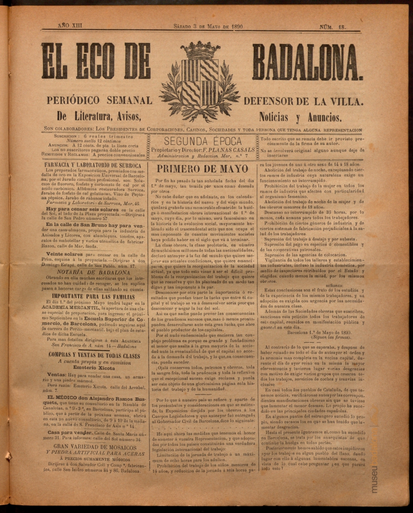 La crònica d’aquell primer 1 de maig a Badalona la tenim de la mà d’ El Eco de Badalona:http://ves.cat/etK0